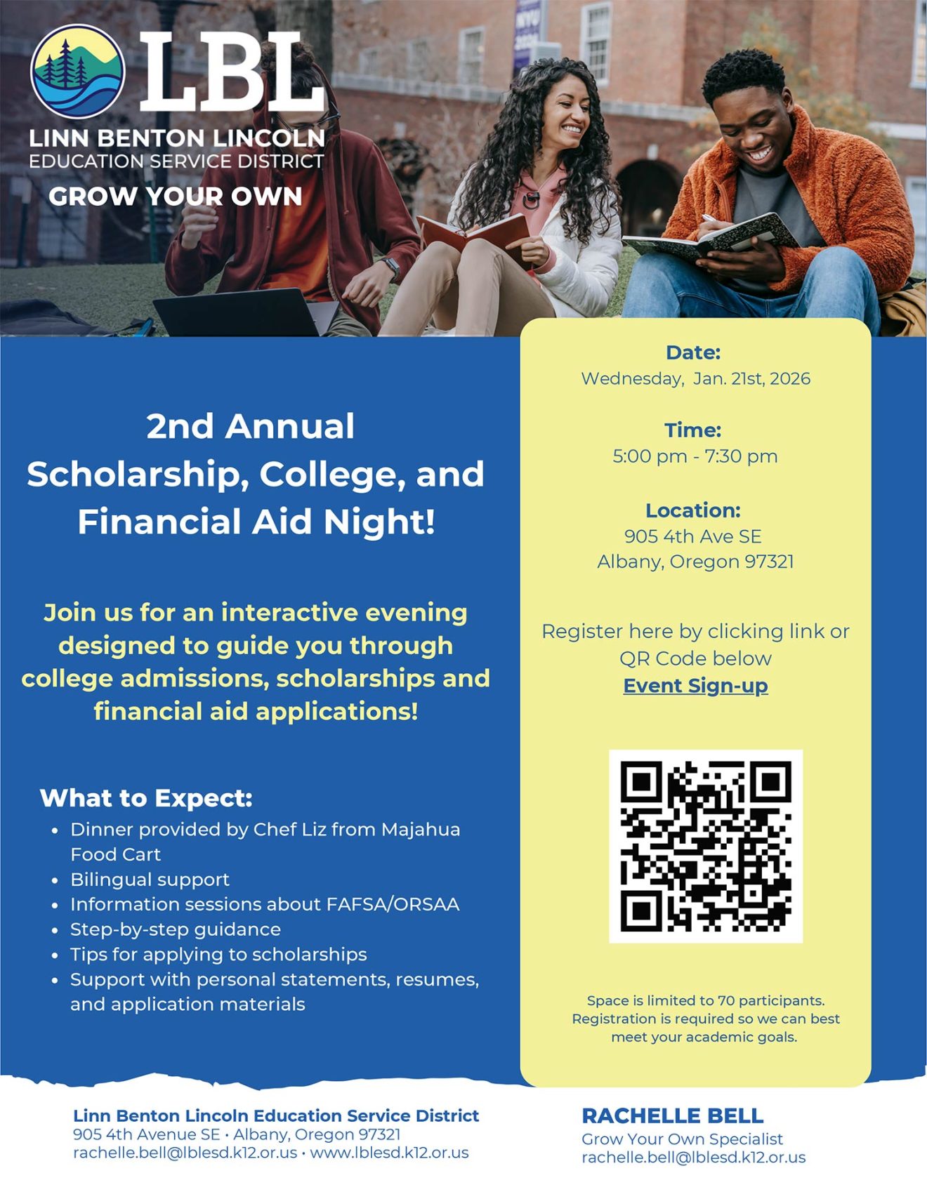 Please join us January 21st, 2026 from 5:00 pm – 7:30 pm as we support you in applying to scholarships, FAFSA, and ORSAA, or understanding the college application process!