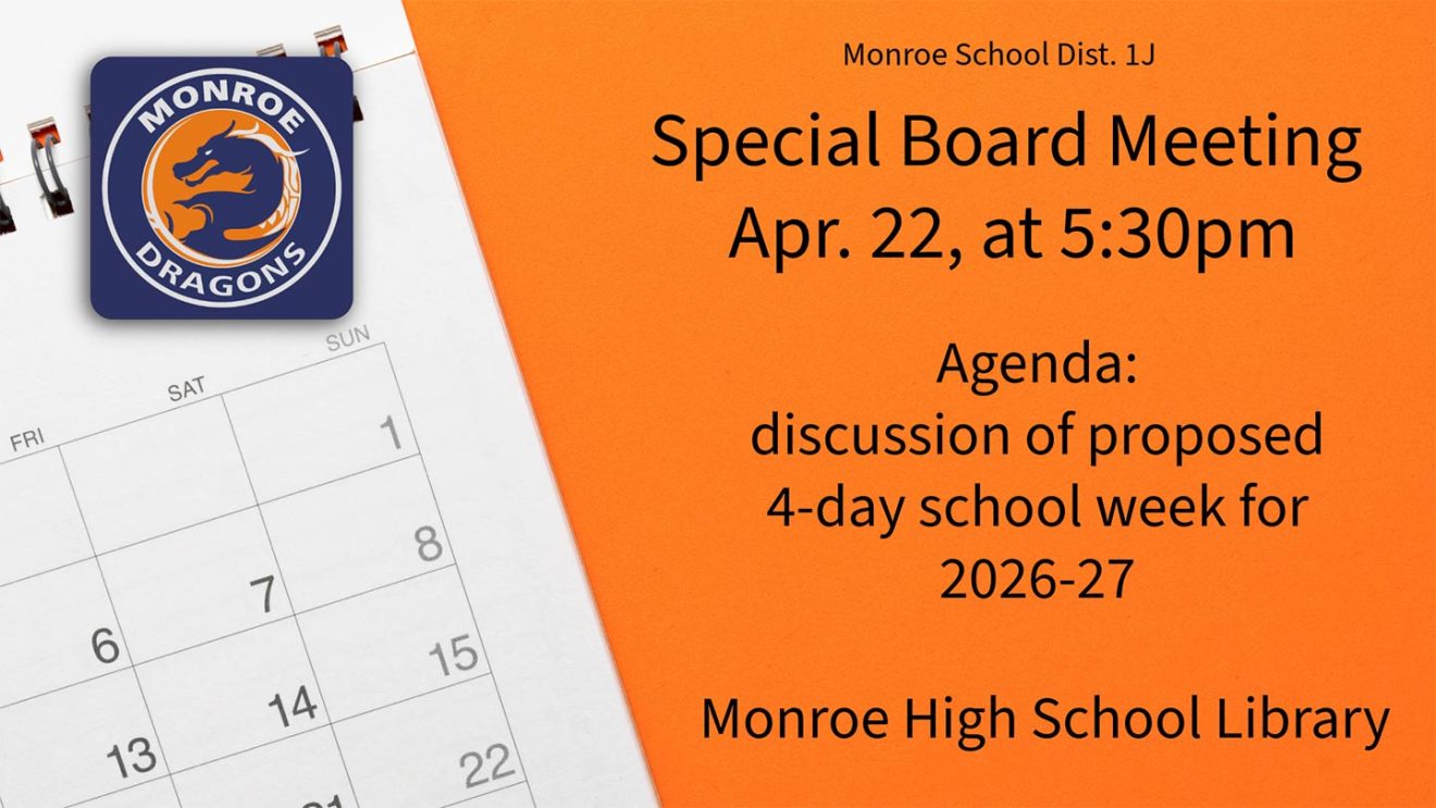 Special Board Meeting (April 22, 2026) April 14, 2026 Special Board Meeting April 22, 2026 at 5:30 p.m. – High School Library Agenda: Discussion of proposed 4-day school week for 2026-27 Share Share